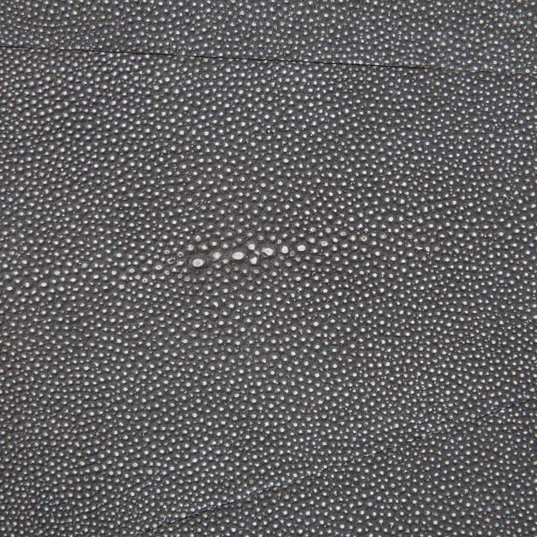 Mid-century shaping takes on modern intrigue in faux shagreen. The round top floats over a triangular iron base with an antique brass or gunmetal finish.