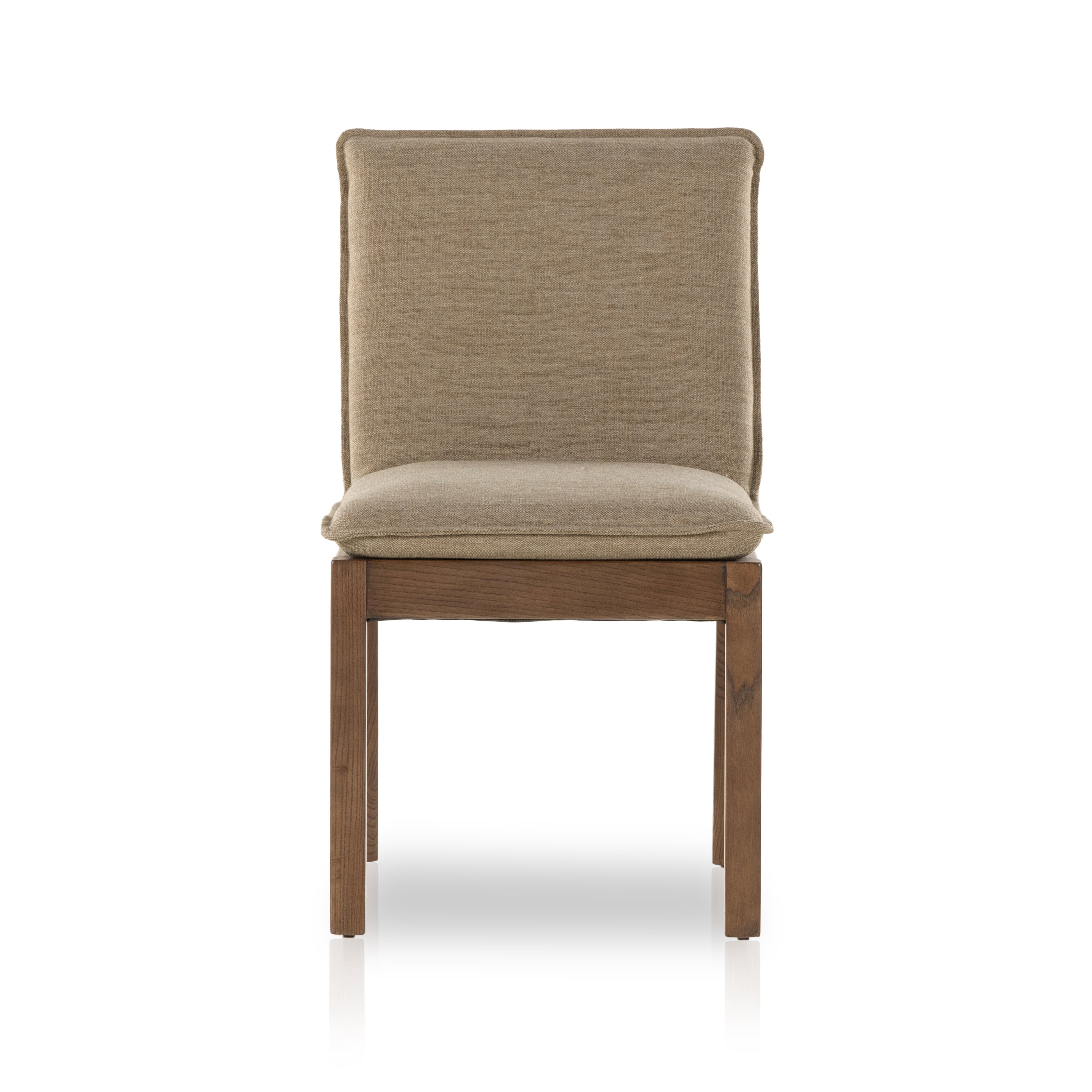 A striking silhouette with design-forward details any way you look at it. Fawn-colored high-performance fabric sits in a solid nettlewood frame, accented with a back of leather strapping & metal buckles.