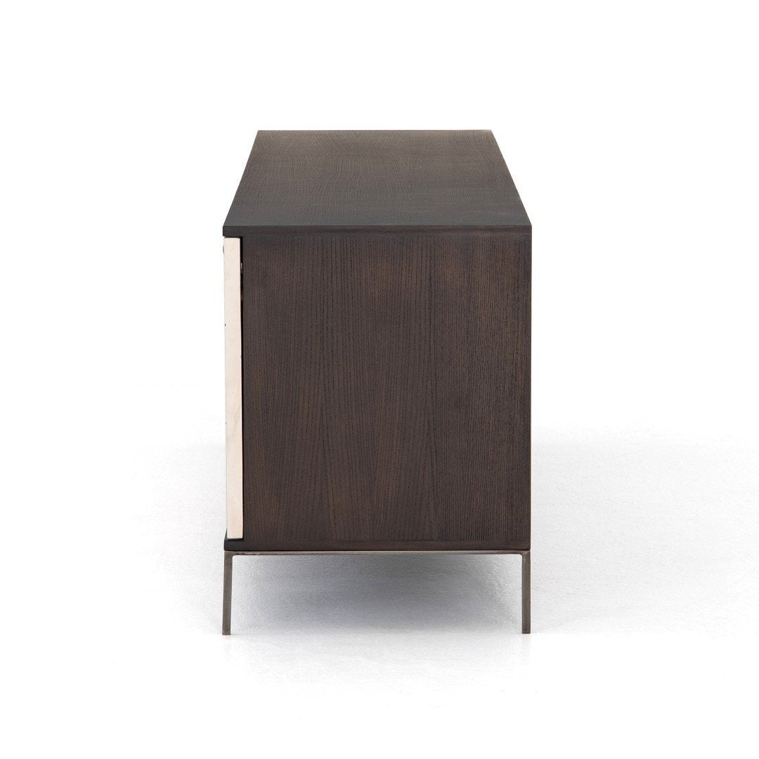 Yukas delivers warmth to minimalist styling. Slender legs of bronzed iron support an ash-finished frame as resin highlights woods' natural graining. Iron detailing for edgy contrast.